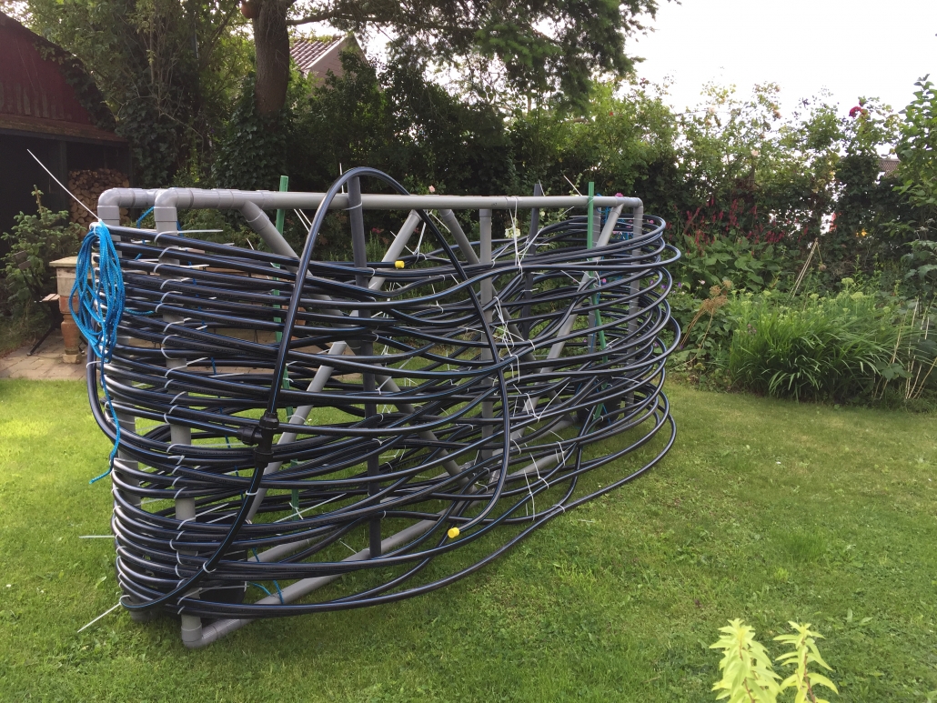 De warmtewisselaar hebben we zelf gemaakt. Een verzinkt landhek, 200m slang (32mm tyleen), hardhouten balken, koppelingen en mantelbuizen zijn thuis afgeleverd. Na een paar dagen knutselen was het klaar. Bijkomend voordeel is dat we het apparaat op maat van de steiger hebben kunnen maken.